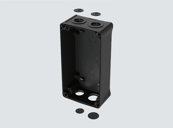 外壳底座可以旋转180度。从而使您可以根据需要灵活地使用M32电缆接头将电源电缆从顶部或底部接入。外壳底座有4个带不同预制螺纹的密封电缆接口(3×M25和1×M32)。您只需打开所需的电缆入口的敲落孔即可轻松完成端接。您也可以从我们这里获取适配于M32和M25的电缆接头作为配件。
