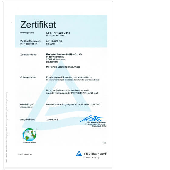 MENNEKES Stecker GmbH & Co. KG成立于2010年初。该公司在德国为汽车制造商及其供应商开发和生产客户定制2型/3型充电接口和电缆,供应电动汽车国内外未来市场。架构和流程面向汽车产业的需求,满足汽车标准TS16949的要求。MENNEKES Stecker GmbH & Co. KG于2012年上半年首次通过ISO/TS 16949认证,并于2018年第一季度通过IATF 16949认证。这再次证明公司满足汽车行业质量管理体系的所有要求。
