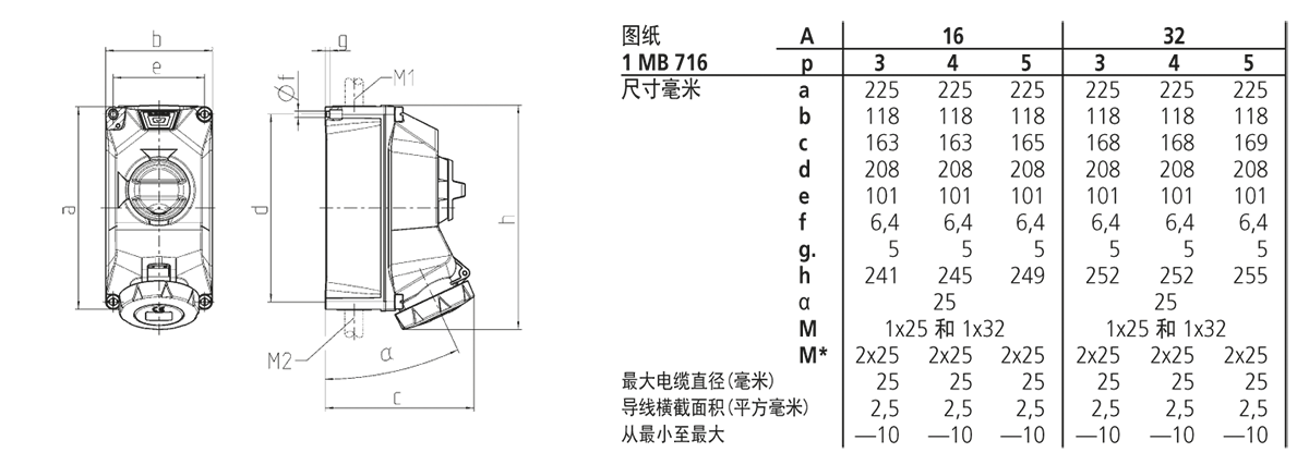 壁装式插座 DUOi 5614306G 使用 IP67 / IP69