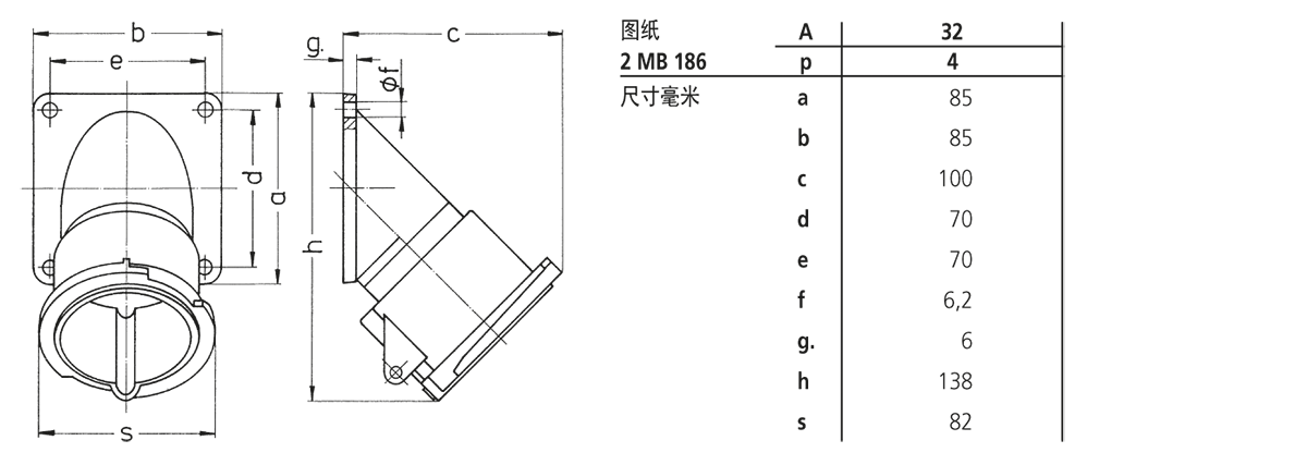 用于 32 A, 4 p 插头