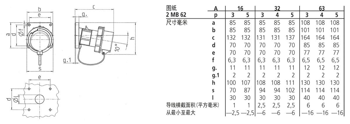 用于防水插头、壁装式和面板式插头 63 A, 3 p - 5 p