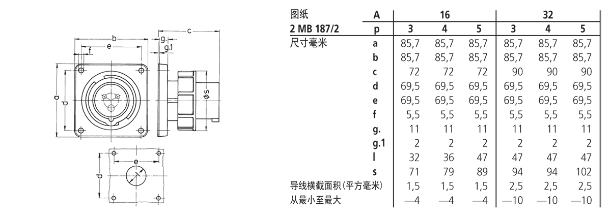 用于防水插头、壁装式和面板式插头 32 A, 3 p + 4 p