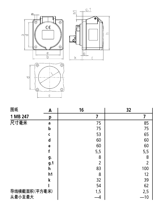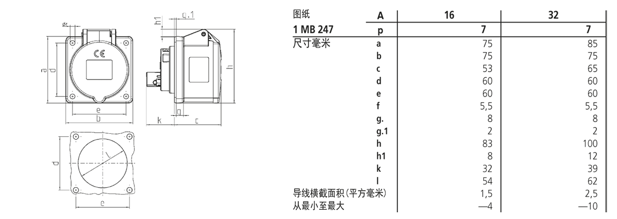 带配件,与法兰一起可用于安装产品组 1046、1056、1134 和 1136 的 16 A 或 32 A 面板式插座