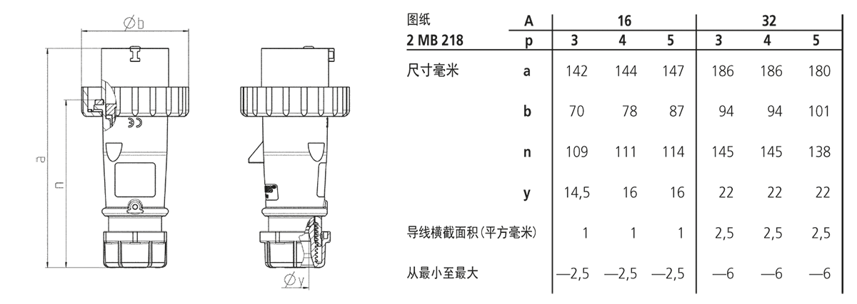 用于防水插头、壁装式和面板式插头 16 A, 3 p